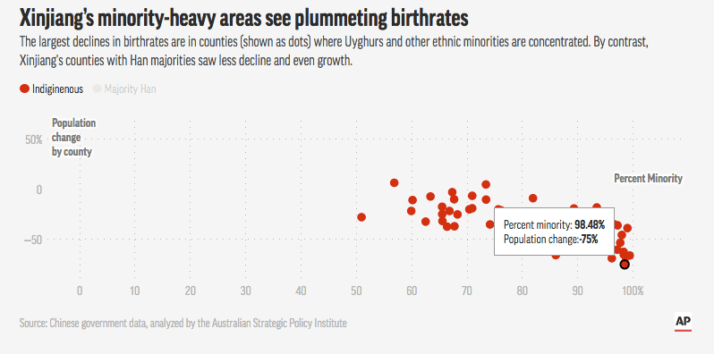 “ أن الانخفاض الأخير في معدلات المواليد في شينجيانغ على مدى عامين أكبر بكثير من إلانخفاض على مستوى البلاد على مدار ٣٦ عامًا كاملة، بسبب سياسة ( الطفل الواحد ) ، والتي بموجبها يخضع الصينيون ( الهان ) لقيود أكثر صرامة على الولادة “